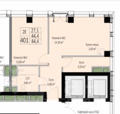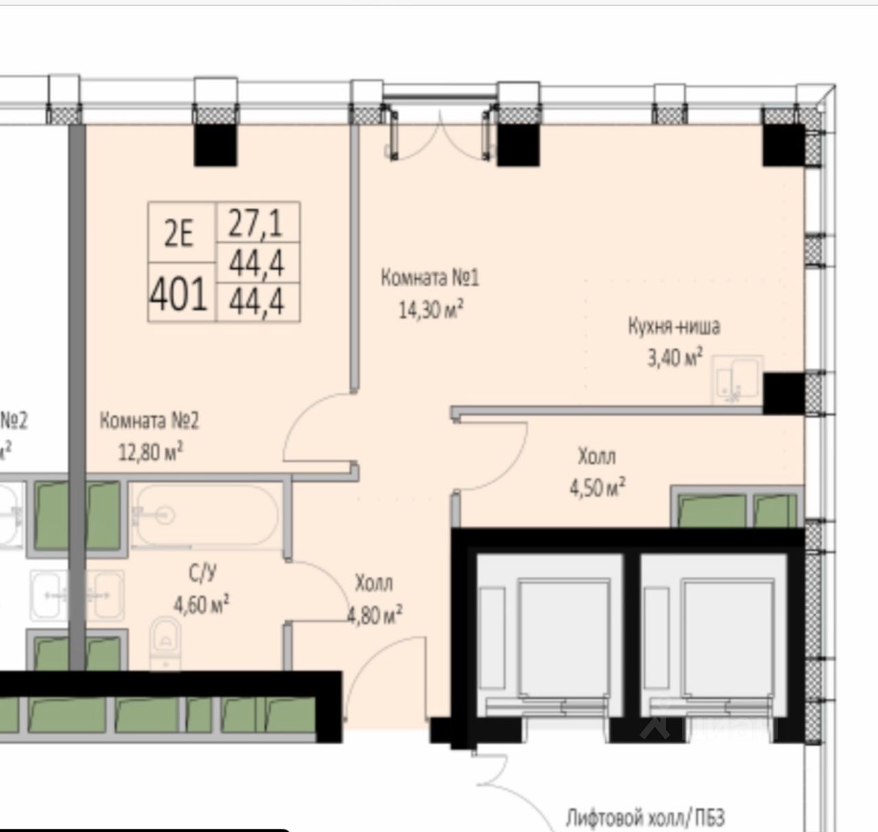 • 44,4 м² — оптимальная площадь для комфортного проживания.
