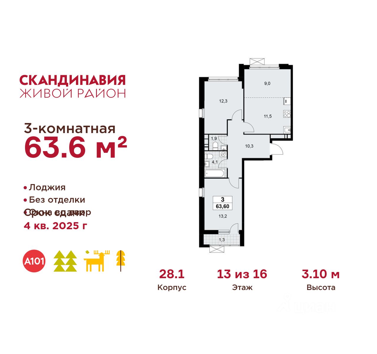 Продается трехкомнатная квартира 150 в новостройке Жилой район "Скандинавия" по адресу Москва, ТиНАО, Новомосковский АО, Сосенское С/П, Коммунарка пос., жилой комплекс Скандинавия, 28.1, район Коммунарка, Новомосковский административный округ, Москва. Общая площадь квартиры - 63.60 кв. м., этаж 13 из 16, секция 2. Тип проекта, по которому построен дом - монолит, компания-застройщик - ООО "А101". Стоимость квартиры - 22008144 Р. Срок сдачи - 4 квартал 2025.