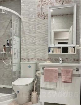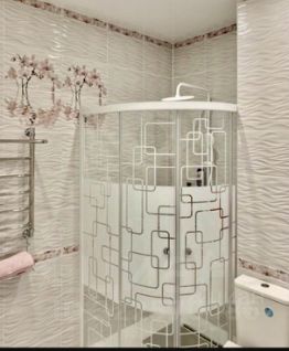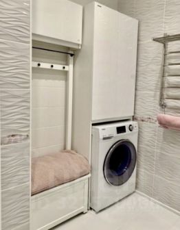 В ванной: принудительная вентиляция, тёплый пол, плитка, натяжной потолок, душевая кабина, большой полотенцесушитель, мебель для ванной, стиральная машина.