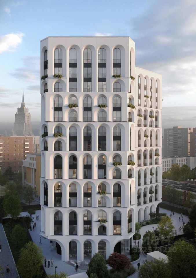 Архитектура выполнена в стиле неомодерн: фасад украшен панорамными французскими балконами и арочными элементами, создающими выразительный облик здания.
