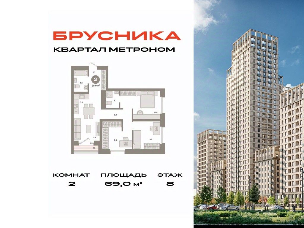 Квартира с кухней-гостиной и двумя спальнями в квартале "Метроном". Особенности планировки: ипотека 8%, гардеробная, вид во двор, лоджия, предчистовая отделка, мастер-спальня.