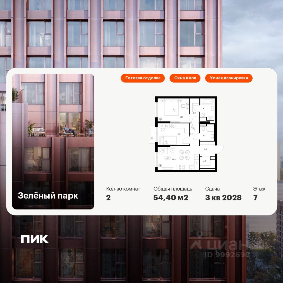 Продаётся 2-комн. квартира площадью 54,4 кв.м на 7 этаже 13 этажного дома (Корпус 5.3, Секция 3) проекта ПИК Зелёный парк. Светлый просторный подъезд на уровне земли, функциональная планировка, большие окна, c отделкой.