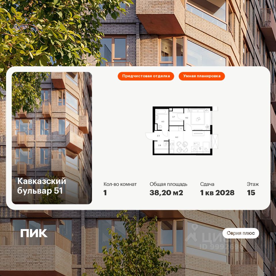 Продаётся 1-комн. квартира площадью 38,2 кв.м на 15 этаже 24 этажного дома (Корпус 3.5, Секция 2) проекта ПИК Кавказский бульвар 51. Светлый просторный подъезд на уровне земли, функциональная планировка, большие окна, предчистовая отделка.