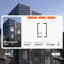 Продаётся квартира-студия площадью 23,6 кв.м на 28 этаже 32 этажного дома (Корпус 4.5, Секция 2) проекта ПИК Мичуринский парк. Светлый просторный подъезд на уровне земли, функциональная планировка, большие окна, c отделкой.