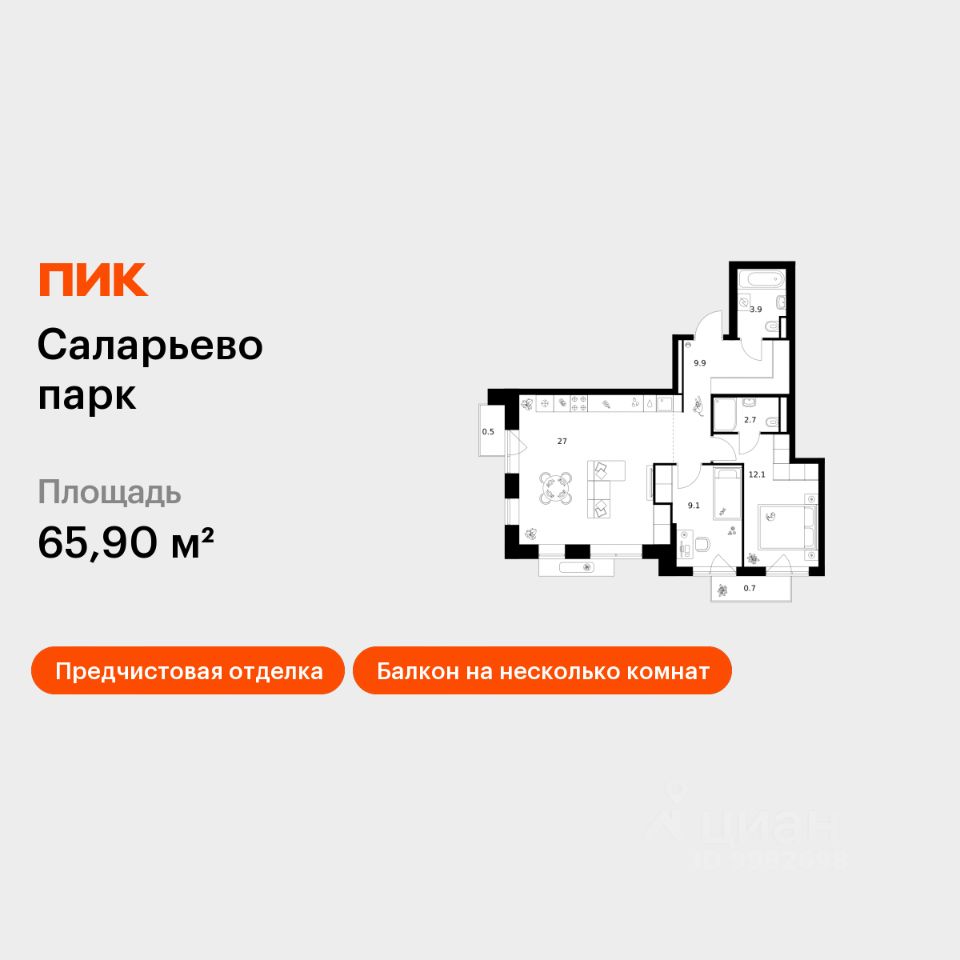 Продаётся 2-комн. квартира площадью 65,9 кв.м на 13 этаже 22 этажного дома (Корпус 57.3, Секция 3) проекта ПИК Саларьево парк. Светлый просторный подъезд на уровне земли, функциональная планировка, большие окна, предчистовая отделка.