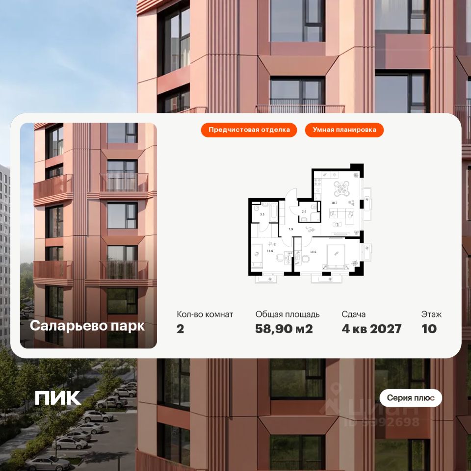 Продаётся 2-комн. квартира площадью 58,9 кв.м на 10 этаже 14 этажного дома (Корпус 57.5, Секция 5) проекта ПИК Саларьево парк. Светлый просторный подъезд на уровне земли, функциональная планировка, большие окна, предчистовая отделка.