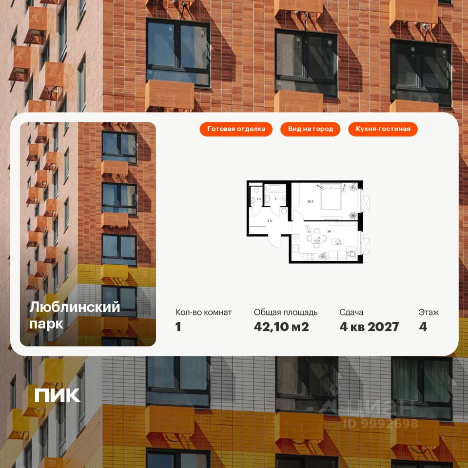 Продаётся 1-комн. квартира площадью 42,1 кв.м на 4 этаже 25 этажного дома (Корпус 19, Секция 1) проекта ПИК Люблинский парк. Светлый просторный подъезд на уровне земли, функциональная планировка, большие окна, c отделкой.