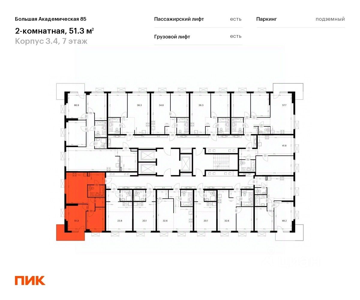 Продаётся 2-комн. квартира площадью 51,3 кв.м на 7 этаже 24 этажного дома (Корпус 3.4, Секция 7) проекта ПИК Большая Академическая 85. Светлый просторный подъезд на уровне земли, функциональная планировка, большие окна, предчистовая отделка.