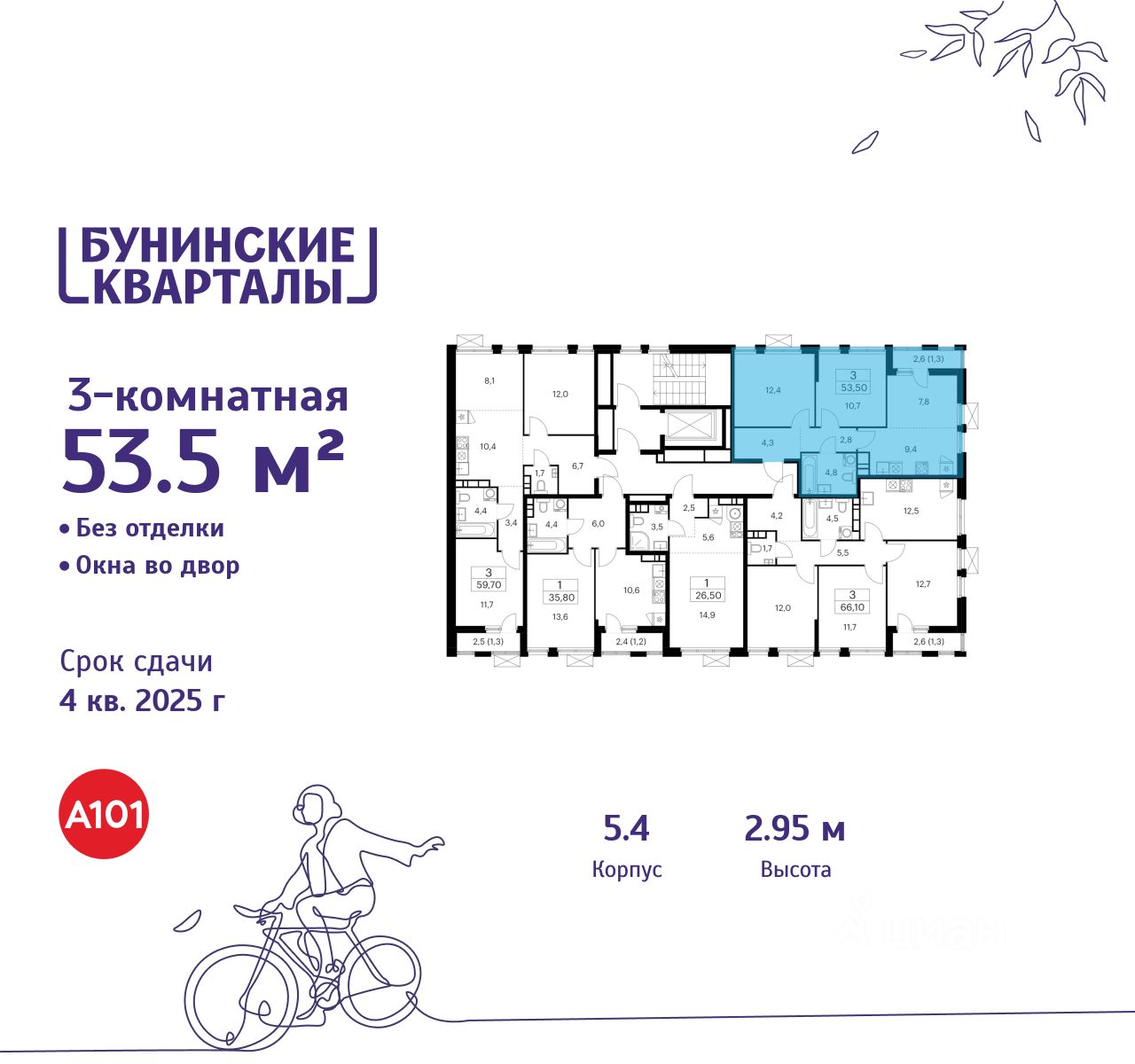 Продается трехкомнатная квартира 1067 в новостройке ЖК "Бунинские кварталы" по адресу Москва, ТиНАО, Новомосковский АО, Сосенское С/П, жилой комплекс Бунинские Кварталы, корп. 5.4. Общая площадь квартиры - 53.50 кв. м., этаж 9 из 9, секция 13. Тип проекта, по которому построен дом - монолит, компания-застройщик - ООО "А101". Стоимость квартиры - 20137935 Р. Срок сдачи - 1 квартал 2026.