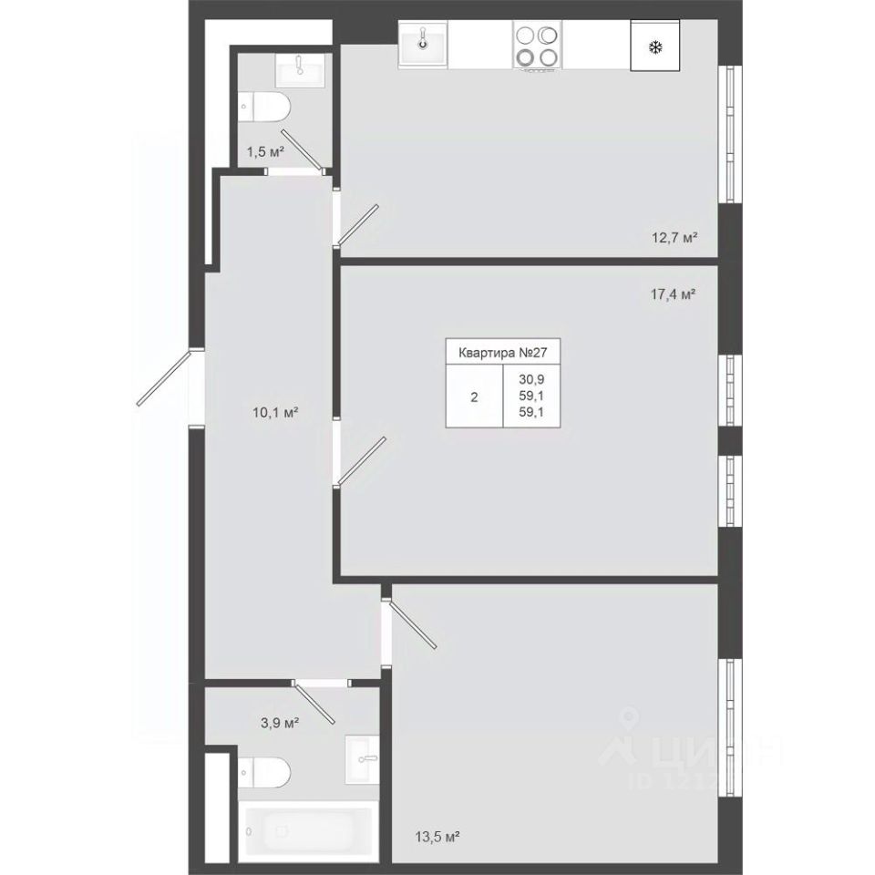 Продается 2-к квартира площадью 59.1 кв.м. на 4-м этаже