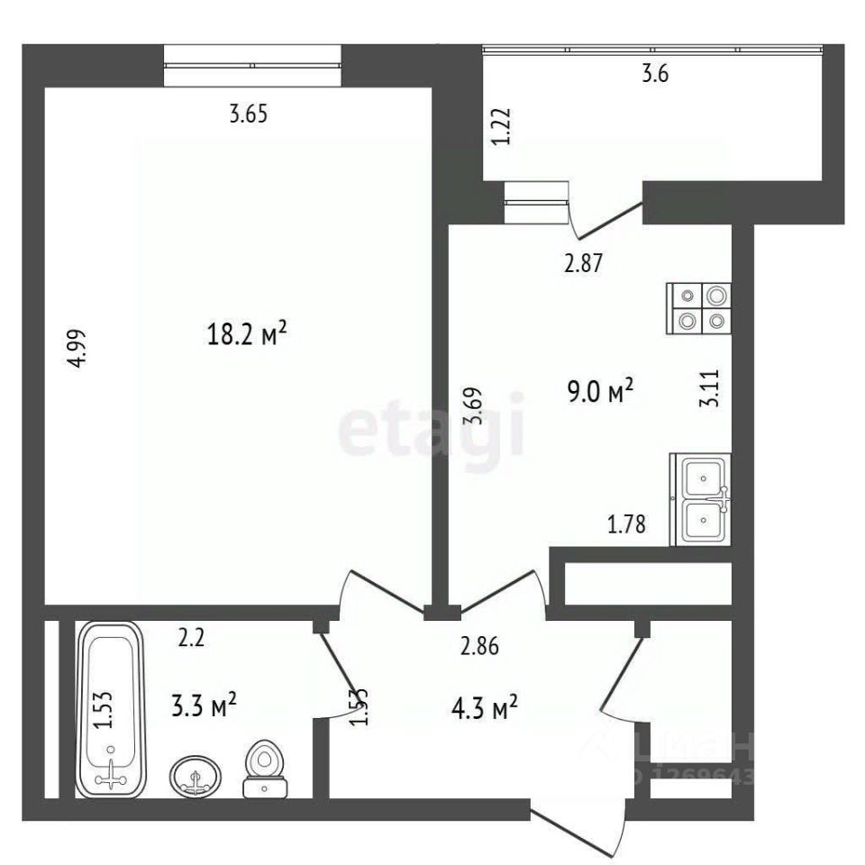 Общая площадь - 36,8 м² + отделанная, остекленная лоджия 4,4 м² (итого 41,2 м²)