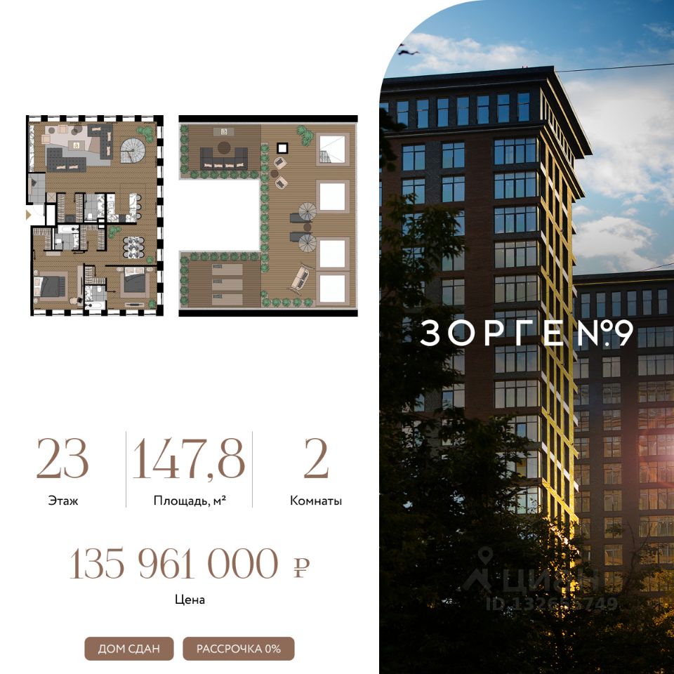 "Зорге 9" — готовые апартаменты бизнес-класса от компании St MICHAEL. 3 современных корпуса с фасадами в стиле архитектуры Нью-Йорка и с сервисами премиальных отелей, высотой до 21 этажа. На верхнем уровне комплекса расположены роскошные просторные пентхаусы с высотой потолка до 4,2 метра и панорамными окнами до 3,6 метров, открывающими великолепные виды на столицу. Пентхаусы с выходами на собственные приватные террасы на кровле, площадью от 150 кв. м являются жильем high-уровня, демонстрирующим высокий статус владельца. В них предусмотрена уникальная опция на потолках есть "световые фонари", дающие максимальный уровень света и воздуха. Свободная планировка, небольшая глубина этажа, огромные панорамные окна в пол и высота потолков до 4,2 м позволят реализовать самые смелые концептуальные идеи и создать идеальный интерьер с учетом всех пожеланий. Вдохновляющие виды на город украсят ваш апартамент лучше любой картины. Есть возможность приобретения дизайн-проекта и полной меблировки апартаментов от партнеров девелопера. Взыскательному вкусу резидентов комплекса соответствуют элегантные лобби с дизайнерской отделкой премиальными материалами, lounge-зона для отдыха и встреч с гостями, кафе с камином и легким эмбиентом, стильная отделка холлов. Престижная локация на Ходынке обеспечит жителей комплекса богатой инфраструктурой исторического района и быстрым доступом к центру города. До делового центра "Москва-Сити" от "Зорге 9" всего 10 минут на автомобиле. "Зорге 9" СДАН, все корпуса введены в эксплуатацию.