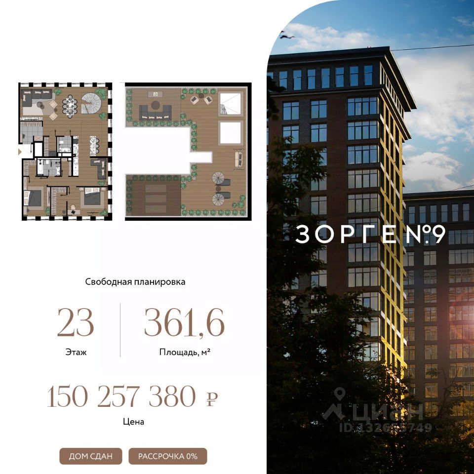 "Зорге 9" — готовые апартаменты бизнес-класса от компании St MICHAEL. 3 современных корпуса с фасадами в стиле архитектуры Нью-Йорка и с сервисами премиальных отелей, высотой до 21 этажа. На верхнем уровне комплекса расположены роскошные просторные пентхаусы с высотой потолка до 4,2 метра и панорамными окнами до 3,6 метров, открывающими великолепные виды на столицу. Пентхаусы с выходами на собственные приватные террасы на кровле, площадью от 150 кв. м являются жильем high-уровня, демонстрирующим высокий статус владельца. В них предусмотрена уникальная опция на потолках есть "световые фонари", дающие максимальный уровень света и воздуха. Свободная планировка, небольшая глубина этажа, огромные панорамные окна в пол и высота потолков до 4,2 м позволят реализовать самые смелые концептуальные идеи и создать идеальный интерьер с учетом всех пожеланий. Вдохновляющие виды на город украсят ваш апартамент лучше любой картины. Есть возможность приобретения дизайн-проекта и полной меблировки апартаментов от партнеров девелопера. Взыскательному вкусу резидентов комплекса соответствуют элегантные лобби с дизайнерской отделкой премиальными материалами, lounge-зона для отдыха и встреч с гостями, кафе с камином и легким эмбиентом, стильная отделка холлов. Престижная локация на Ходынке обеспечит жителей комплекса богатой инфраструктурой исторического района и быстрым доступом к центру города. До делового центра "Москва-Сити" от "Зорге 9" всего 10 минут на автомобиле. "Зорге 9" СДАН, все корпуса введены в эксплуатацию.