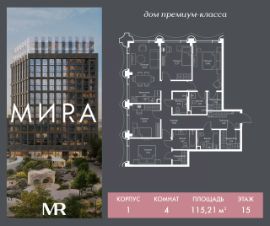 Продаётся 4-к квартира общей площадью 115.21 м² без отделки в доме премиум-класса МИRА на 15-м этаже 17 этажного дома. Квартира расположена в корпусе 1.