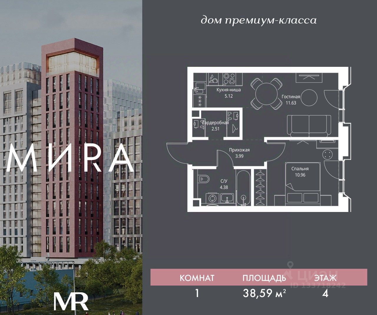 Продаётся 1-комнатная квартира общей площадью 38.59 м² без отделки в доме премиум-класса МИRА на 4-м этаже 23 этажного дома. Квартира расположена в корпусе 2.