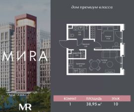Продаётся 1-комнатная квартира общей площадью 38.95 м² без отделки в доме премиум-класса МИRА на 10-м этаже 23 этажного дома. Квартира расположена в корпусе 2.