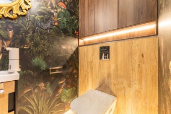 Стильный гостевой санузел в зоне входной группы. Сантехника Jacob Delafon, известная эстетикой и износостойкостью.