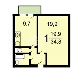• Общая площадь — 35 м, жилая — 20 м, кухня — 9,7 м;