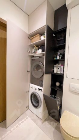 В постирочном шкафу располагается СМ Siemens, сушильная машина Asko и большое количество полок для хранения. Проточный водонагреватель Electrolux.