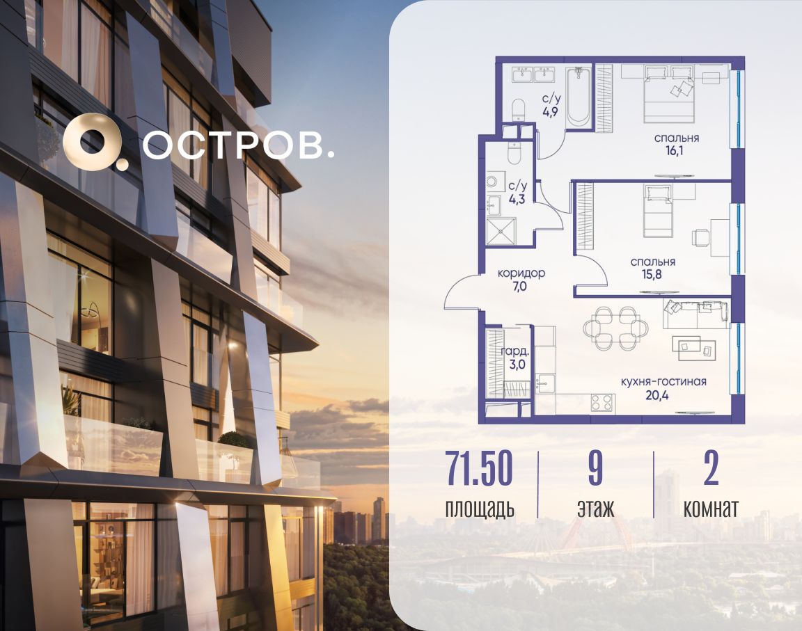 Продаётся 2-комн. квартира от застройщика: общая площадь 71.50 м², жилая 31.90 м², кухня 20.40 м², 9-й этаж, жилой квартал "Остров 5", корпус 6 (секция 1). Срок сдачи: 3 квартал 2025 года.