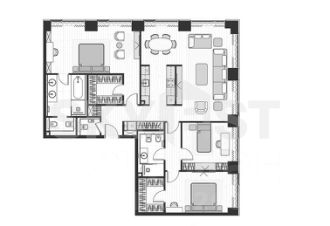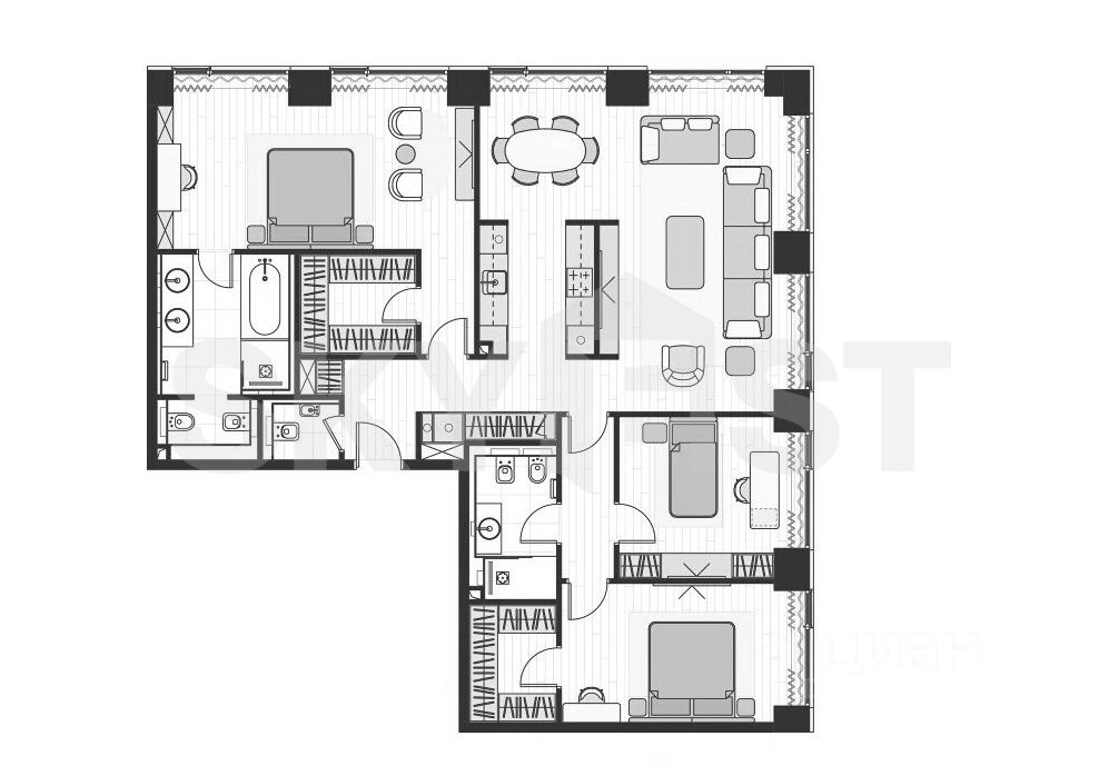 Планировка: кухня-гостиная, спальня с ванной комнатой и гардеробной, 2 спальни, ванная комната, гардеробная, гостевой санузел.