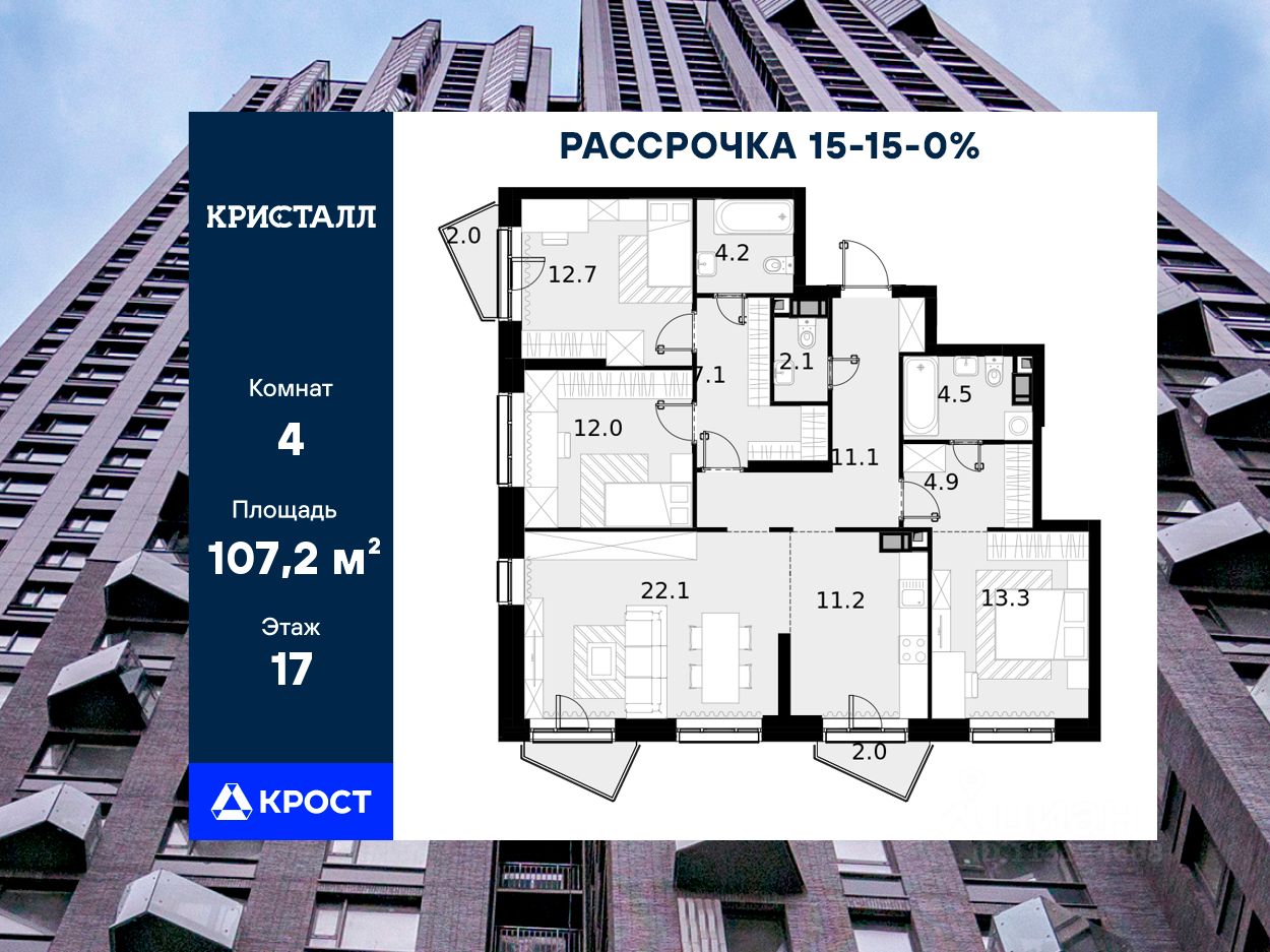 Четырёхкомнатная квартира площадью 107,2 кв.м. на 17 этаже дома бизнес-класса "Трилогия Кристалл".
