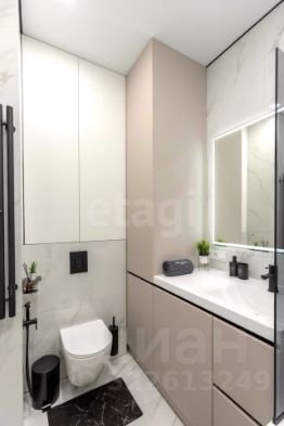 Продуманная эргономика: вся мебель выполнена на заказ. Встроенная техника мировых брендов (холодильник, посудомойка с автооткрыванием, стиральная машина с сушкой), умный пол с подогревом и кондиционеры. Ни о чем не нужно беспокоиться.