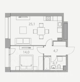Планировка: одна изолированная комната, кухня-гостиная, совмещенный санузел. Окна выходят во двор.