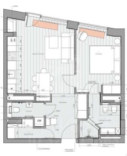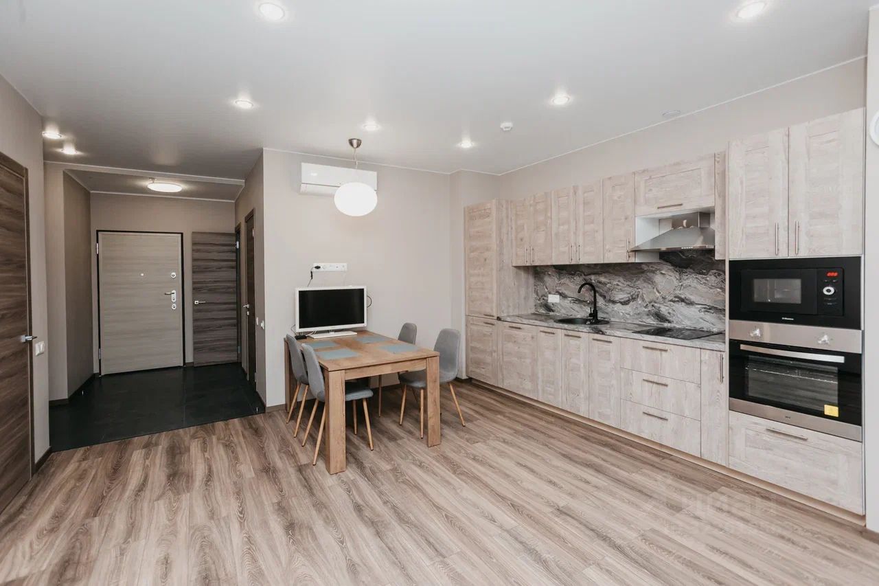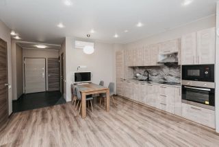 Планировка: просторная гостиная-кухня, светлая прихожая, спальня, санузел с душем, гостевой санузел и гардеробная.