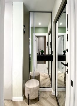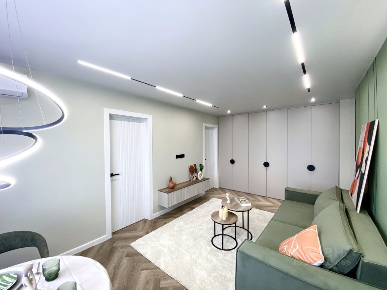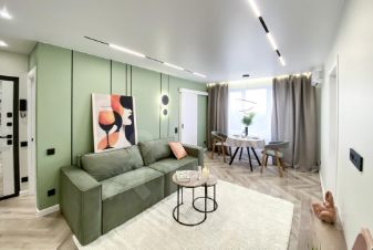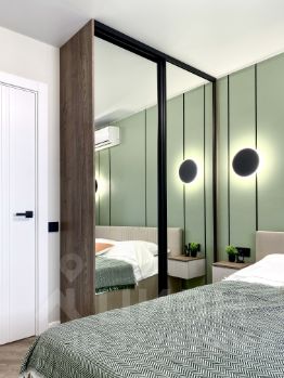 В квартире по плану: две спальные комнаты, в одной из комнат большой застекленный балкон, кухня-гостиная с возможностью зонировать гостиную от кухни раздвижной дверью. Шкафы в гостиной и спальне решают вопрос дефицита мест хранения. Вся встроенная мебель изготовлена по индивидуальному эскизу, на заказ. Кровать с ортопедическим матрасом и подъемным механизмом. В гостиной - раскладной диван. Стол в обеденной зоне также имеет раскладной механизм. На кухне есть 2 дополнительных места для приема пищи в суетливое утреннее время. Для выполнения ремонта использованы дорогие отделочные материалы, плитка из керамогранита в ванной, премиальный кварцвинил английская елка на полу в гостиной, комнатах и кухни, которому не страшен даже потоп. Пол в ванной с подогревом.