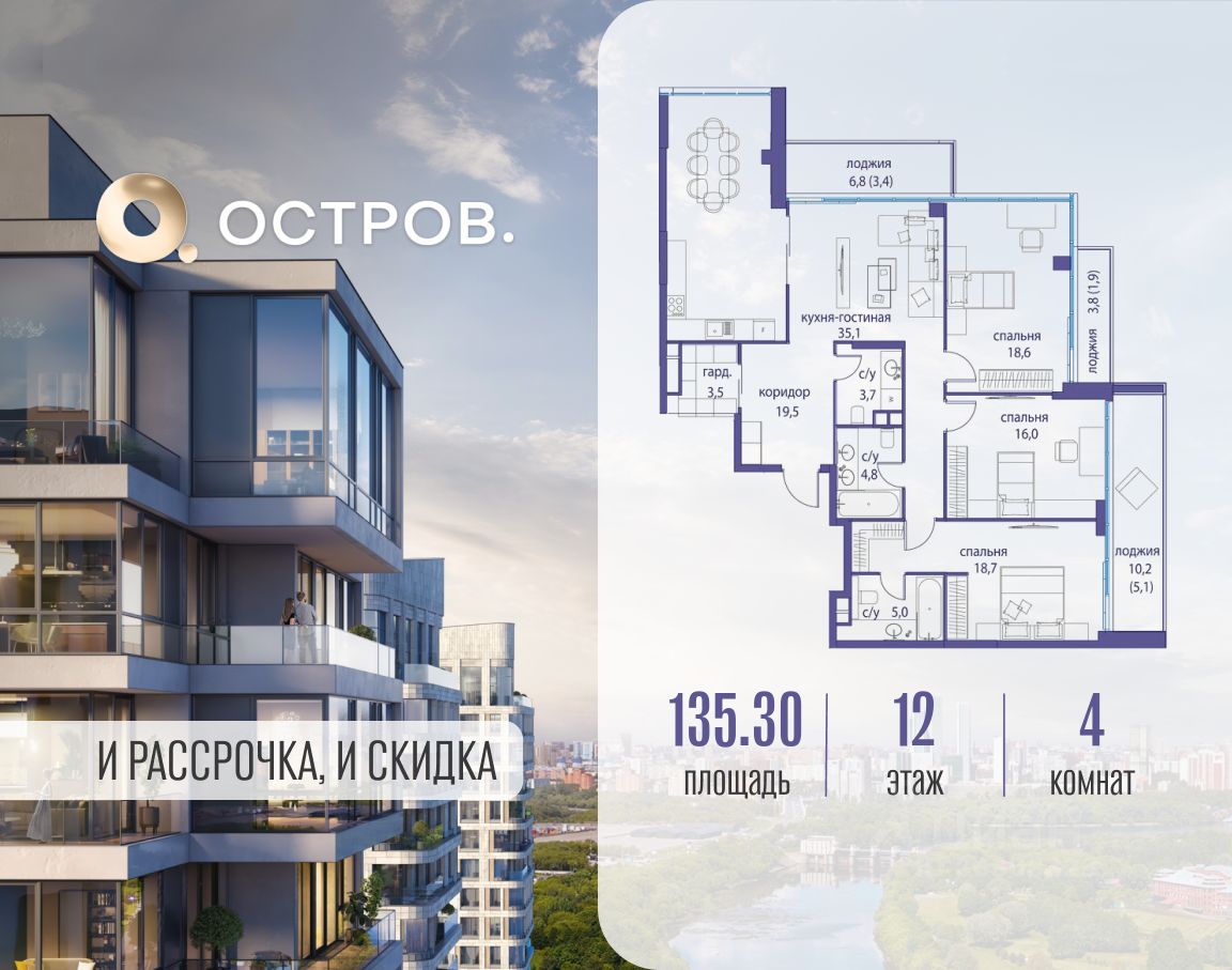 Продаётся четырехкомнатная квартира от застройщика: общая площадь 135.30 м², жилая 53.30 м², кухня 35.10 м², 12, жилой квартал "Остров 4", корпус 4 (4 квартал) (секция 1). срок сдачи: 4-кв. 2025.