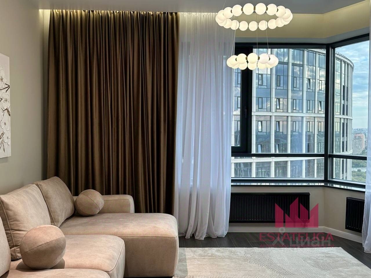 ЖК: Территория комплекса представляет из себя 3 корпуса архитектурой в форме лепестков. Закрытая территория, подземный паркинг, консьерж-сервис. Во дворе пруд и летний кинотеатр, своя школа, а также охрана, видеонаблюдение, автомойка, зарядки для электромобилей и система пожаротушения.