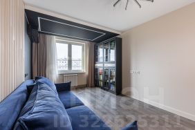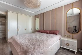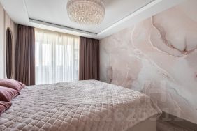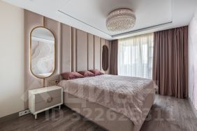 Спальня: Эмалевый шкаф купе во всю высоту, каркас спальной кровати на заказ с мягкой стеновой панелью с зеркалами и натуральной латунью, на противоположной стене декоративное панно. Дорогой премиальный многослойный матрас высотой 40 см и размерами 2,0м*1,8м. 2 эмалевые прикроватные тумбы. В присоединенной лоджии теплый пол с удаленным управлением. Электрические шторы с удаленным управлением или таймером. Проходная система освещения. Окна выходят в тихий двор.
