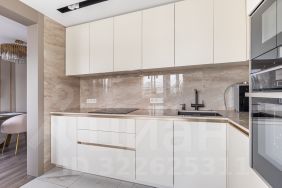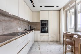 Кухня: стены выполнены из итальянского керамогранита, эмалевая кухня с немецкими механизмами BLUM, керамическая столешница DEKTON у кухни и барной стойке с устойчивостью к царапинам и устойчивостью к любым холодным/горячим температурам, рулонные жалюзи + шторы. Из кухни холодный остекленный балкон с видом на Садовое кольцо и Москва-Сити и возможностью устройства места для хранения.