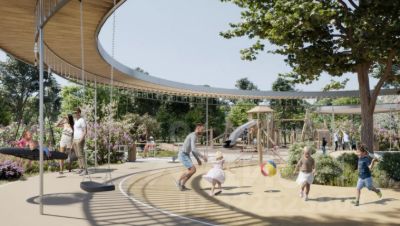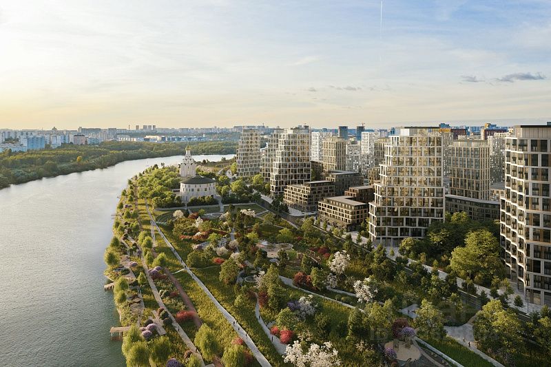 Панорамный вид 360 на живописную набережную Москва-реки и зелёный ландшафт нового современного парка.