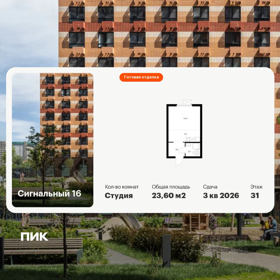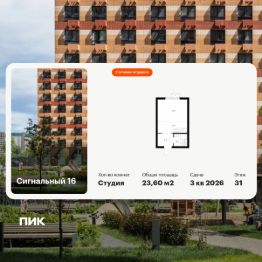 Продаётся квартира-студия площадью 23,6 кв.м на 31 этаже 33 этажного дома (Корпус 2.1.1, Секция 1) проекта ПИК Сигнальный 16. Светлый просторный подъезд на уровне земли, функциональная планировка, большие окна, c отделкой.