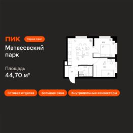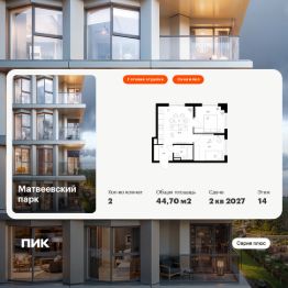 Продаётся 2-комн. квартира площадью 44,7 кв.м на 14 этаже 14 этажного дома (Корпус 4.7, Секция 4) проекта ПИК Матвеевский парк. Светлый просторный подъезд на уровне земли, функциональная планировка, большие окна, c отделкой.