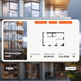 Продаётся 2-комн. квартира площадью 58,8 кв.м на 11 этаже 13 этажного дома (Корпус 4.5, Секция 3) проекта ПИК Матвеевский парк. Светлый просторный подъезд на уровне земли, функциональная планировка, большие окна, c отделкой.
