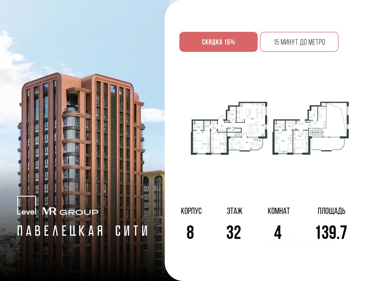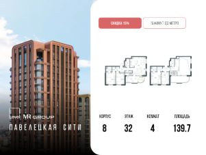 В Даниловском районе столицы (ЮАО) продаётся 4-комнатная квартира площадью 139.70 кв.м без отделки. Квартира расположена на 32 этаже -этажного корпуса 'Горизонт' в жилом комплексе бизнес-класса Павелецкая Сити. Высота потолков 3.00м.