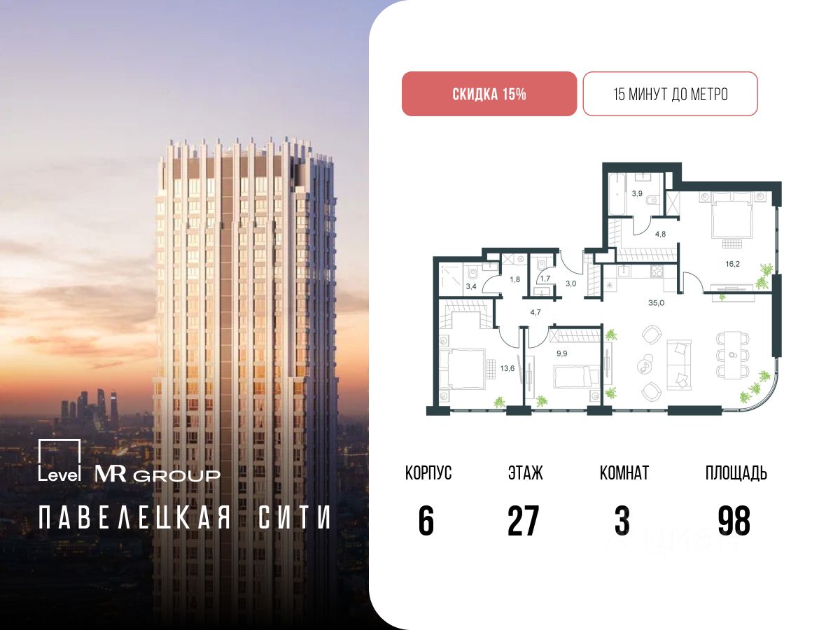 В Даниловском районе столицы (ЮАО) продаётся 3-комнатная квартира площадью 98.00 кв.м без отделки. Квартира расположена на 27 этаже -этажного корпуса 'Горизонт' в жилом комплексе бизнес-класса Павелецкая Сити. Высота потолков 3.00м.