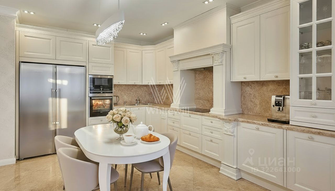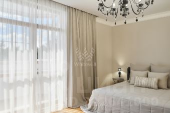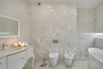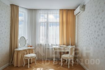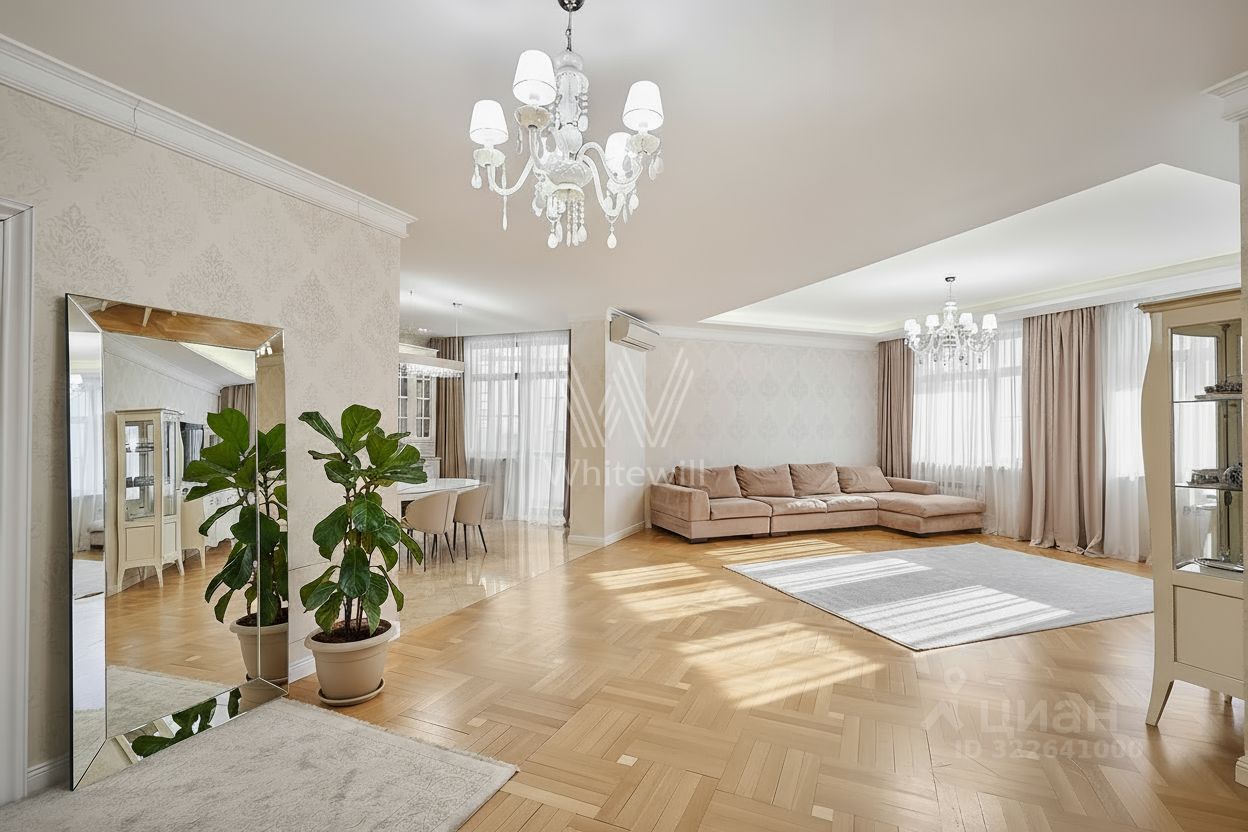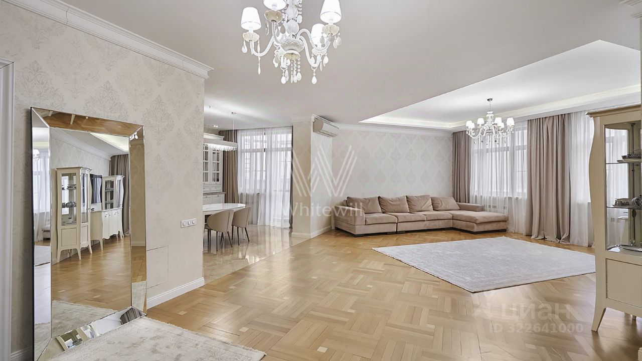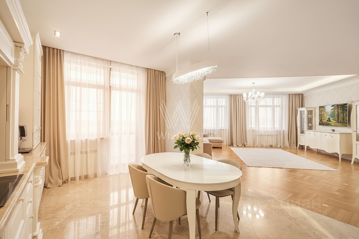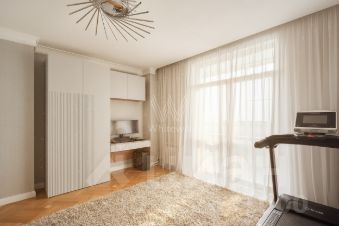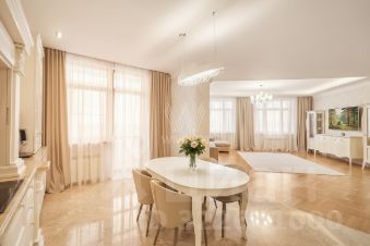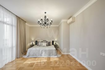 Квартира с тремя спальнями в комплексе бизнес-класса "Доминион" в Раменках. Квартира общей площадью сто восемьдесят семь м² расположена на четырнадцатом этаже в пятом корпусе. Выполнена дизайнерская отделка в современном стиле, на полу выложены паркетная доска и мрамор. Квартира укомплектована итальянской мебелью и премиальной техникой.