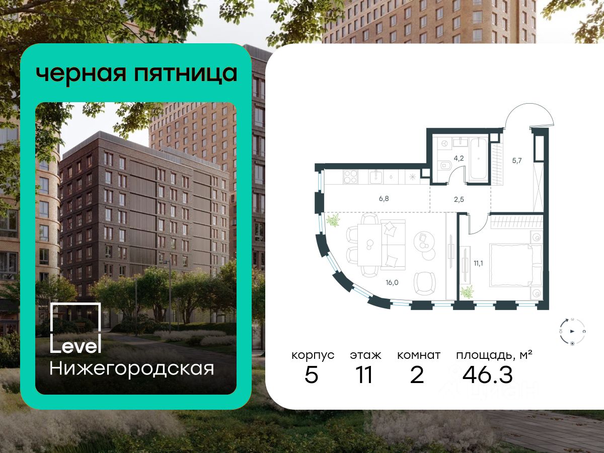 В активно развивающемся районе на юго-востоке столицы продается 2-комнатная квартира площадью 46,3 кв.м с отделкой "white box".. Квартира расположена на 11 этаже 29-этажного этажного корпуса Корпус 5 в жилом комплексе комфорт-класса Level Нижегородская (компания Level Group/Левел групп).