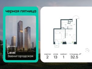 В престижном районе Хорошёво-Мнёвники продаётся 1-комнатная квартира площадью 32.50 кв.м нет. Квартира расположена на 13 этаже 64 этажного корпуса Корпус 2 в жилом комплексе класса комфорт+ Level Звенигородская (компания Level Group/Левел групп).