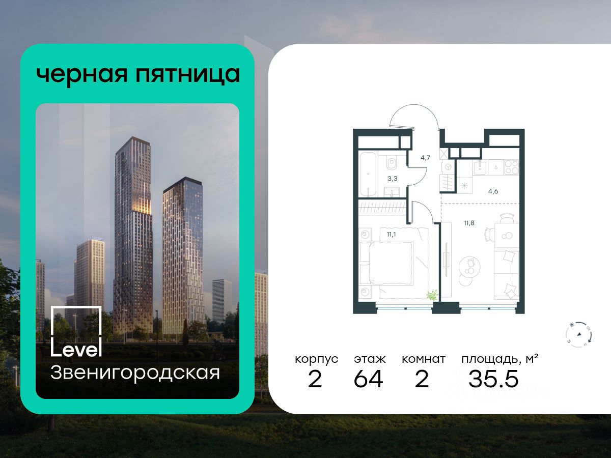 В престижном районе Хорошёво-Мнёвники продаётся 2-комнатная квартира площадью 35.50 кв.м нет. Квартира расположена на 64 этаже 64 этажного корпуса Корпус 2 в жилом комплексе класса комфорт+ Level Звенигородская (компания Level Group/Левел групп).