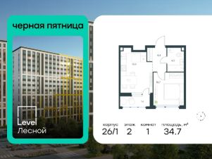 В районе, утопающем в густой зелени лесов, многочисленных парков и скверов, продаётся 1-комнатная квартира площадью 34.70 кв.м с отделкой white box. Квартира расположена на 2 этаже в жилом комплексе комфорт-класса Level Лесной (компания Level Group/Левел групп).