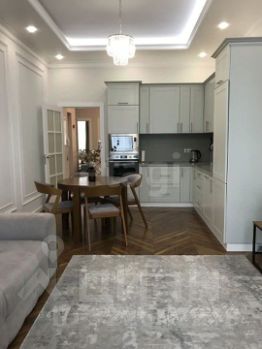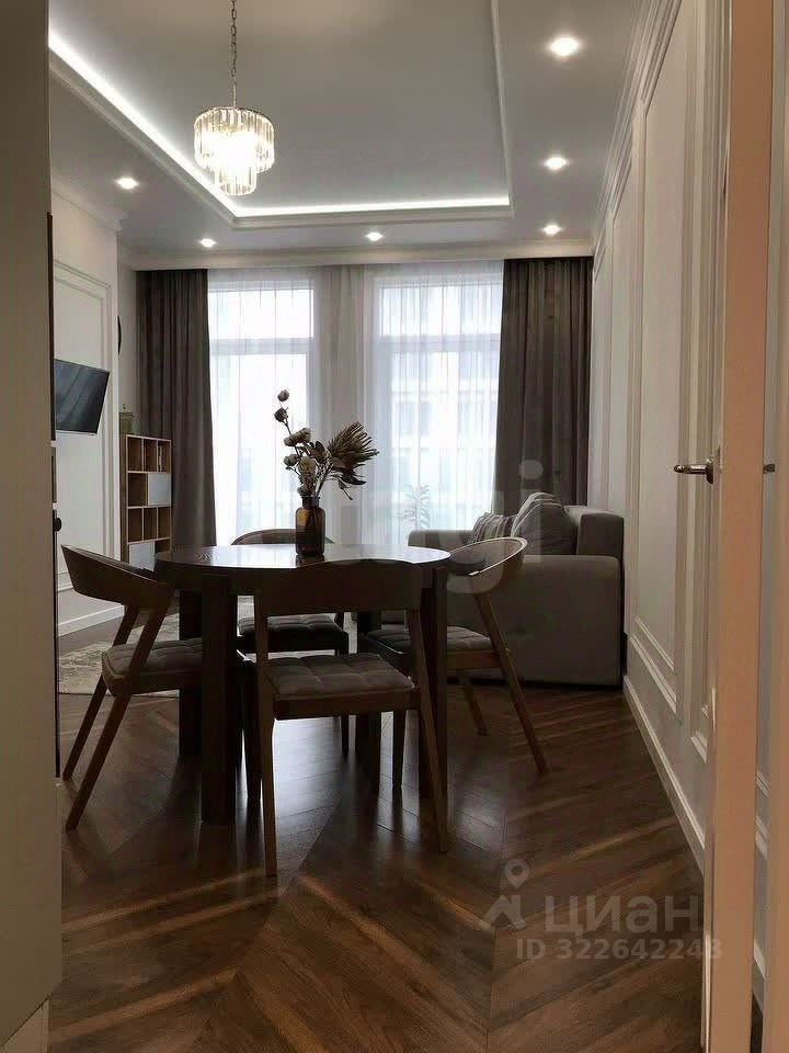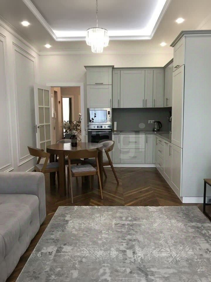 Квартира включает две изолированные спальни, большую кухню-гостиную, две раздельные ванные комнаты (гостевая с душевой кабиной) и гардеробную. Высота потолков составляет 3,2 метра. Выполнен качественный дизайнерский ремонт с системой "теплый пол". Продажа осуществляется с полной меблировкой и встроенной техникой премиум-сегмента: индукционная плита, духовой шкаф, холодильник, посудомоечная и стиральная машины. ЖК обеспечен круглосуточной охраной и видеонаблюдением, применяется концепция "двор без машин", а для жителей доступен подземный паркинг.
