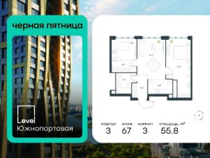 В северной части района Печатники продается 3-комнатная квартира площадью 55.80 кв.м без отделки. Квартира расположена на 67 этаже 68-этажного корпуса Корпус 3 в жилом комплексе комфорт-класса Level Южнопортовая (компания Level Group/Левел групп).