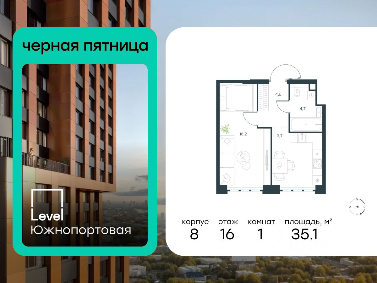 В северной части района Печатники продается 1-комнатная квартира площадью 35.10 кв.м без отделки. Квартира расположена на 16 этаже 49-этажного корпуса Корпус 8 в жилом комплексе комфорт-класса Level Южнопортовая (компания Level Group/Левел групп).