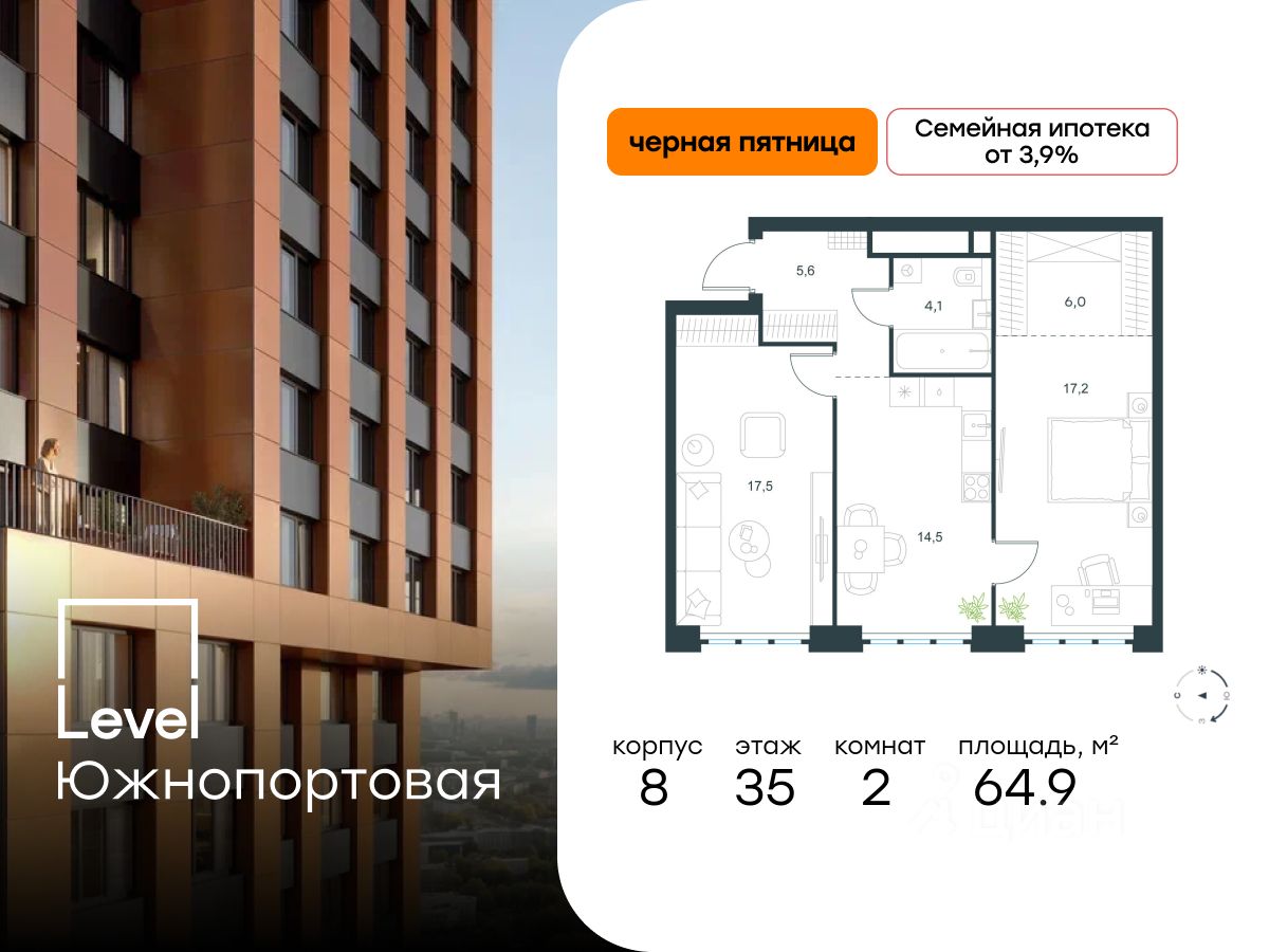 В северной части района Печатники продается 2-комнатная квартира площадью 64.90 кв.м без отделки. Квартира расположена на 35 этаже 49-этажного корпуса Корпус 8 в жилом комплексе комфорт-класса Level Южнопортовая (компания Level Group/Левел групп).
