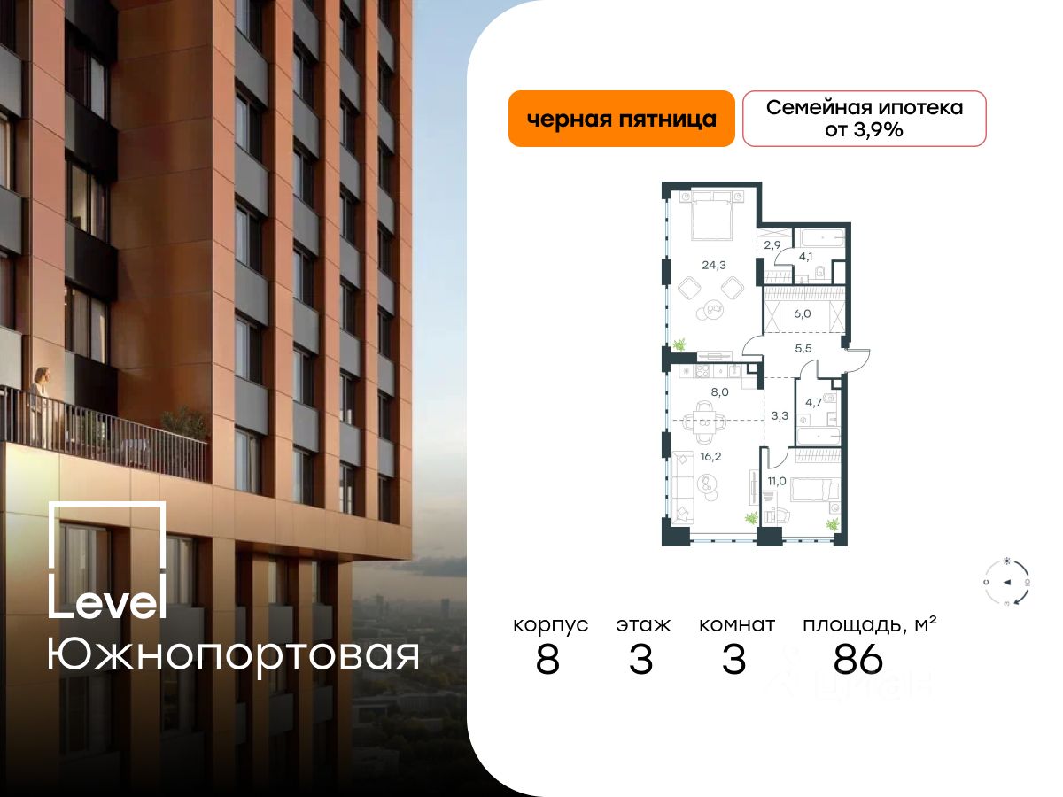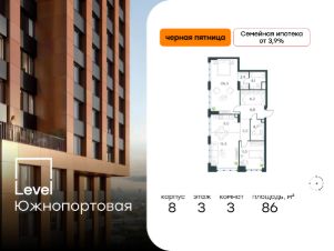 В северной части района Печатники продается 3-комнатная квартира площадью 86.00 кв.м без отделки. Квартира расположена на 3 этаже 49-этажного корпуса Корпус 8 в жилом комплексе комфорт-класса Level Южнопортовая (компания Level Group/Левел групп).